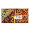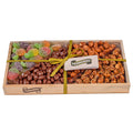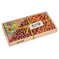 This wooden gift with a triangular compartment design includes a handcrafted selection of: