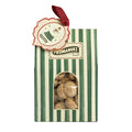 Viene presentado en una elegante caja de cartón suave al tacto y el contenido dentro de una bolsa plástica lo que garantiza la frescura y calidad de las galletas.
